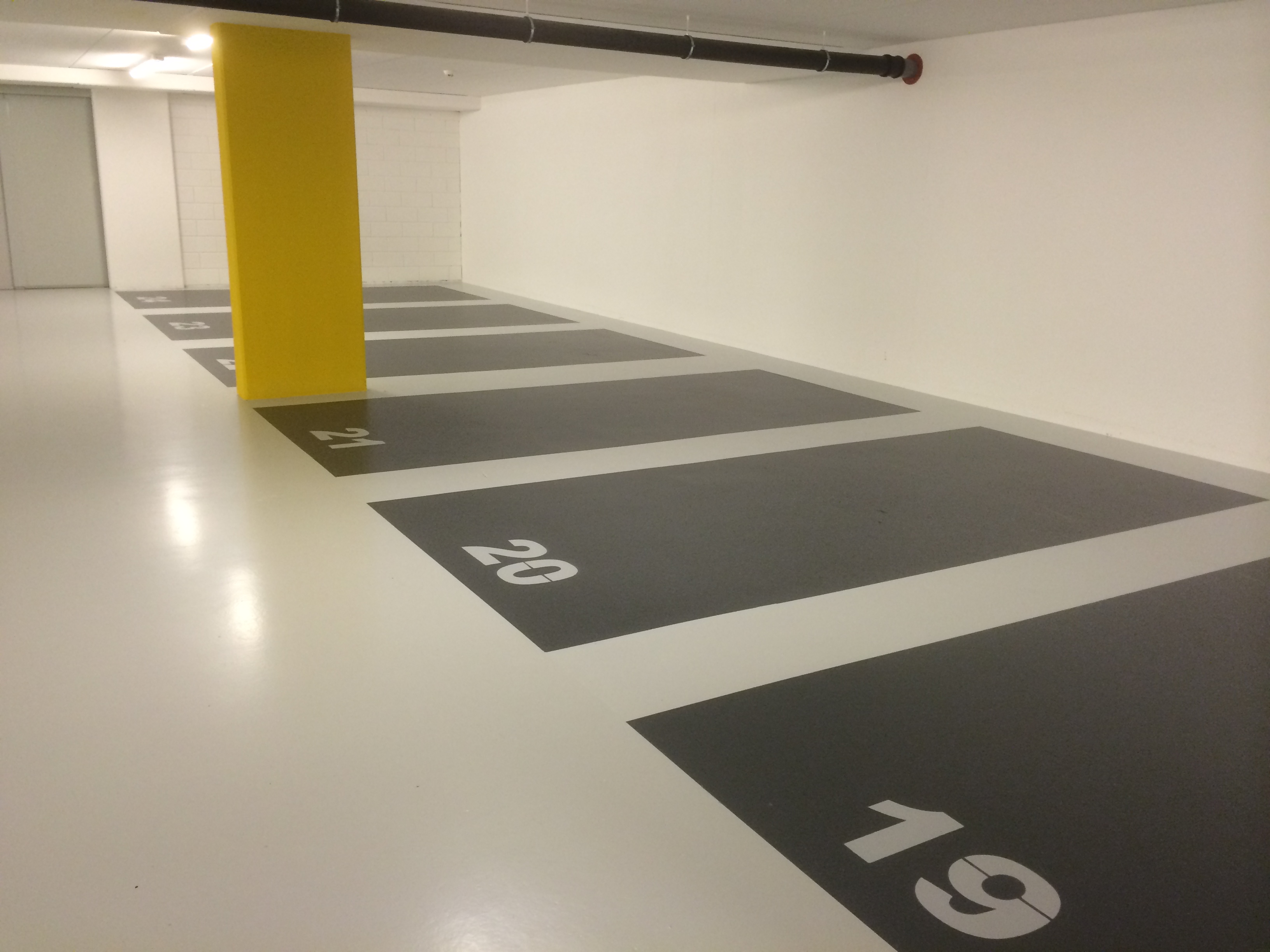 Parkeervakken aangebracht in een parkeergarage te Cuijk. Uitgevoerd in een witte 2k wegenverf met een uitsparing van het nummer.